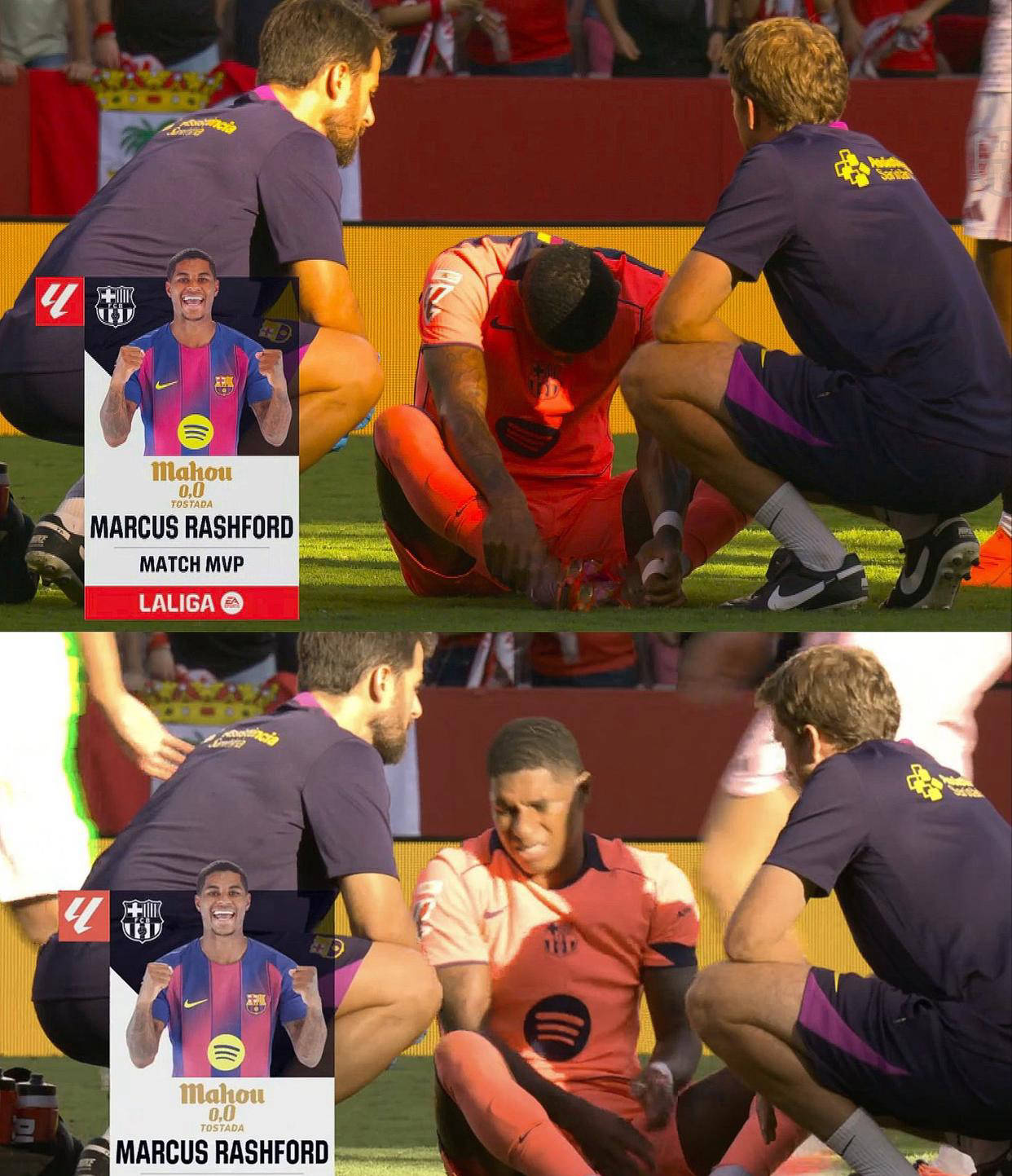 拉什福德的进球技术令人赞叹,他接佩德里的传球左脚凌空抽射得手,帮助巴萨缩小比分差距至1-2。虽然比赛结束时拉什福德因一次受伤坐倒在地,但报道指出这只是轻微问题,他在治疗后离开球场,并未受到严重影响。